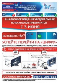 Напомним, в конце прошлого года осуществлен полномасштабный запуск цифрового телевидения – смоляне получили возможность смотреть бесплатно 20 телеканалов в высоком цифровом качестве. Правительственная комиссия по развитию телерадиовещания утвердила План поэтапного отключения аналогового вещания обязательных общедоступных телерадиоканалов в регионах России. В соответствии с ним Смоленская область и еще 56 субъектов Федерации входят в третью волну отключения – дата назначена на 3 июня 2019 года.