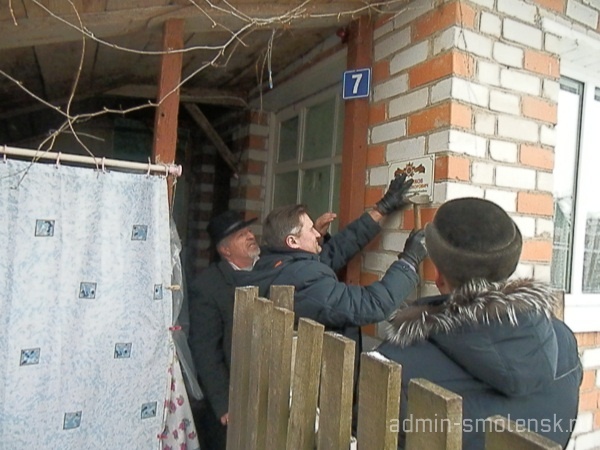 27 февраля в Краснинском районе стартовал проект «Дом со звездой» - установка на домах, где проживают участники Великой Отечественной войны именных табличек. Проект направлен на увековечение памяти героев и участников Великой Отечественной войны. В этот день именную табличку установили на стены дома, в котором проживает ветеран Великой Отечественной войны, почетный гражданин Смоленской области Пахоменков Владимир Ульянович. Организаторами мероприятия выступил отдел образования Администрации муниципального образования "Краснинский район" Смоленской области совместно с газетой "Краснинский край". На торжественном мероприятии присутствовали исполняющий полномочия Главы муниципального образования «Краснинский район» Смоленской области В.Н. Попков, начальник отдела городского хозяйства Администрации муниципального образования «Краснинский район» Смоленской области В.А. Шендалев, специалист первой категории отдела образования Администрации муниципального образования "Краснинский район" Смоленской области Ю.В. Юденкова, учащиеся Краснинской средней школы. Право установить именную табличку было предоставлено исполняющему полномочия Главы муниципального образования «Краснинский район» Смоленской области В.Н. Попкову.
