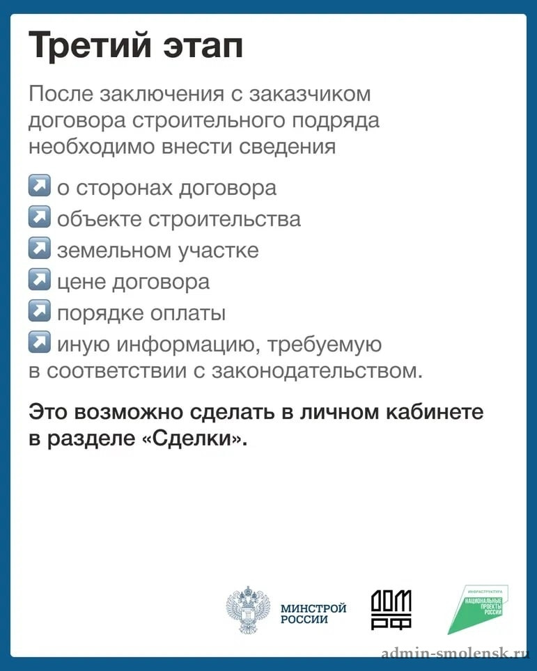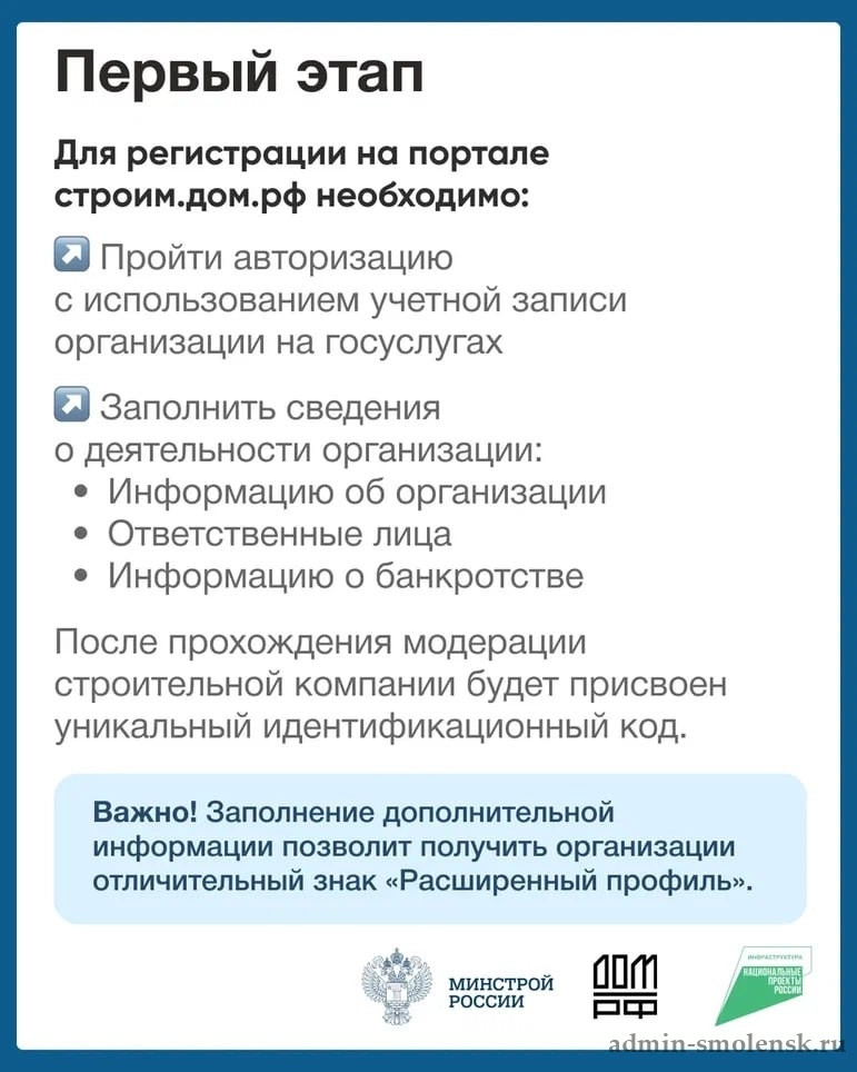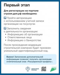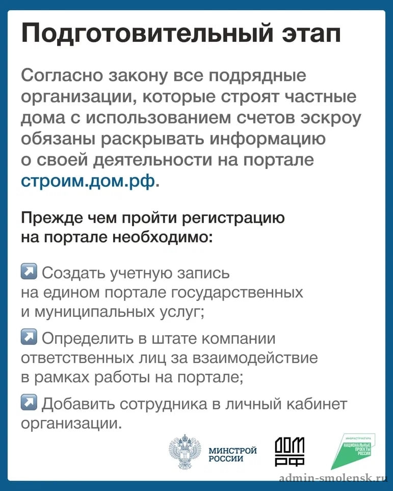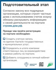 Карточки подскажут, как начать работу с эскроу-счетами при строительстве индивидуальных жилых домов. Начните с регистрации на портале строим.дом.рф и подготовки учетной записи организации!