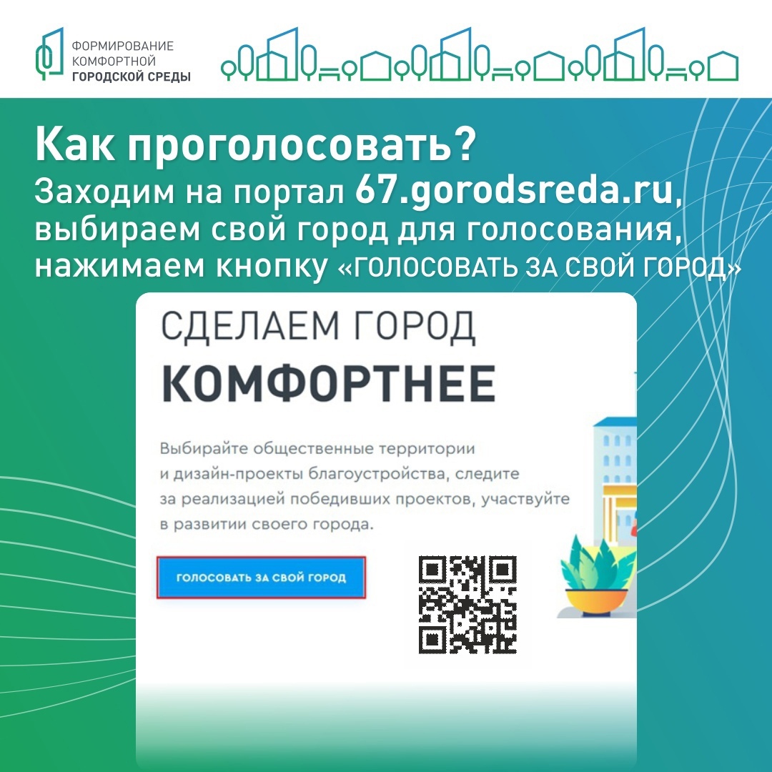 Напоминаем, на платформе 67.gorodsreda.ru проходит голосование, в результате которого жители Смоленской области смогут выбрать дизайн-проекты благоустройства общественных территорий в рамках реализации федерального проекта «Формирование комфортной городской среды».