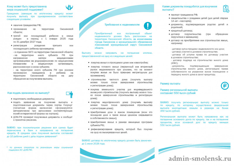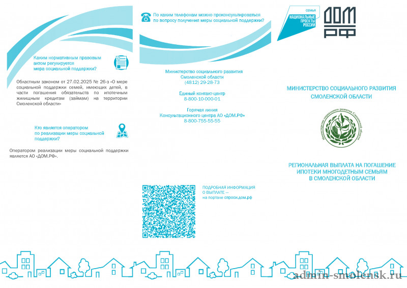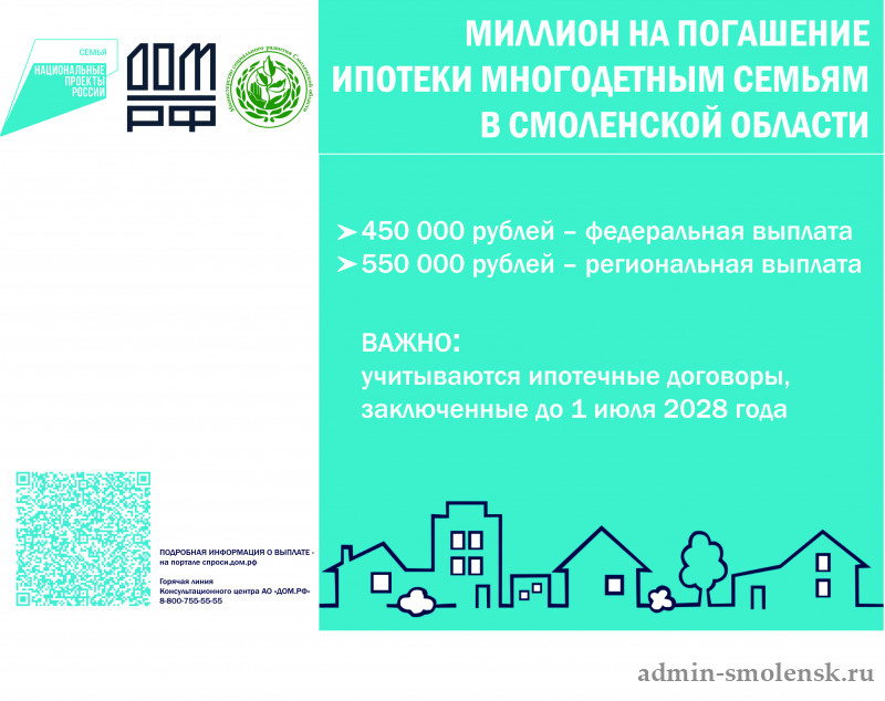 1. В рамках нацпроекта «Семья» на территории Смоленской области предоставляется выплата на полное или частичное погашение обязательств по ипотечному жилищному кредиту.