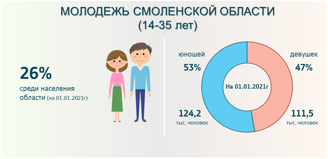 Молодыми людьми считается всё население от 14 до 35 лет включительно. В Смоленской области на начало 2021 года проживало 235,8 тыс. человек в этом возрасте (четвертая часть от всего населения), из них 124,2 тыс. – юноши и 111,5 тыс. – девушки, большинство (73%) проживает в городской местности.