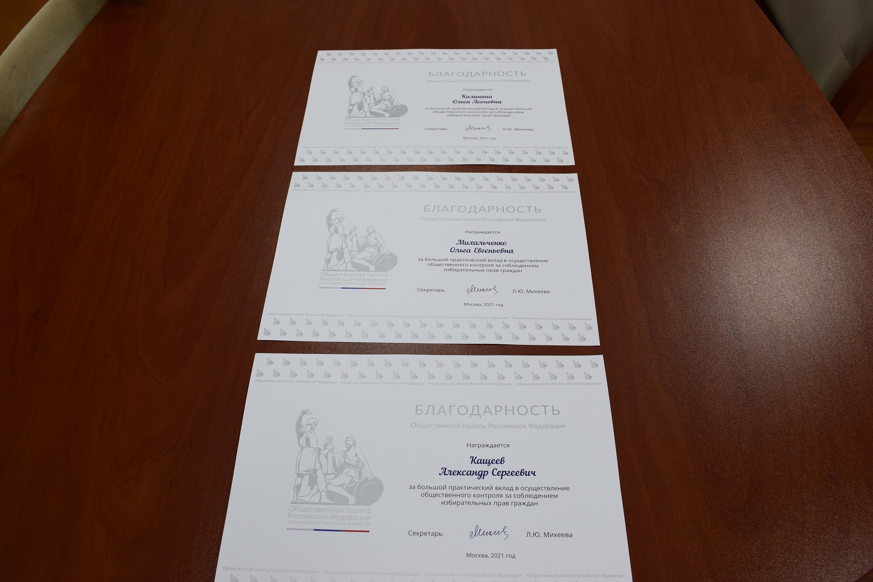 Сегодня Глава района Сергей Валентинович Архипенков вручил благодарности Общественной палаты Российской Федерации Кащееву Александру Сергеевичу и Михальченко Ольге Евгеньевне за большой практический вклад в осуществление общественного контроля за соблюдением избирательных прав граждан. Также была отмечена благодарностью Общественной палаты Российской Федерации Калинина Ольга Леоновна.