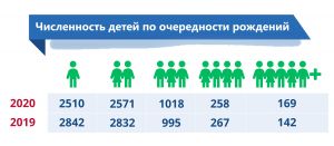 В структуре очередности рождений 2 510 детей (38%) – первенцы, 2 571 ребенок (39%) – вторые, 1 018 детей (16%) – третьи и 427 детей (7%) – четвертые и далее по очередности рождений.