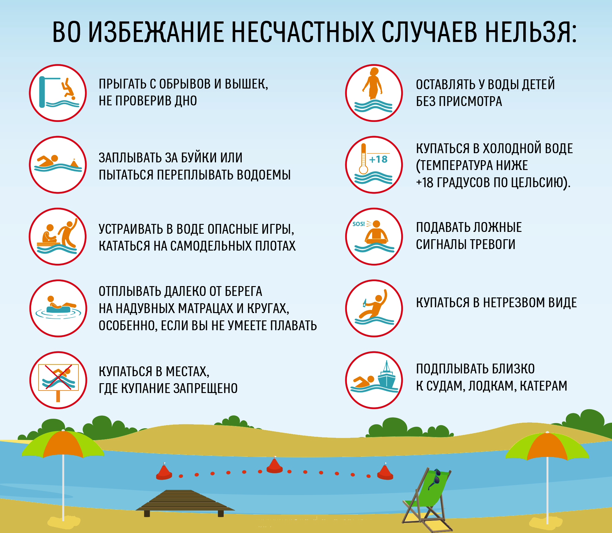 - даже в жаркую погоду не купаться дольше 15 минут подряд, чтобы не переохладиться, при длительном пребывании человека в воде и при переохлаждении могут возникнуть судороги;