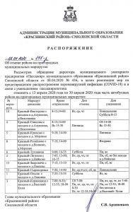 Согласно распоряжению Администрации района от 29.04.2020 № 192-р в связи с неблагополучной ситуацией по коронавирусной инфекции и сокращением пассажиропотока срок установленной распоряжением Администрации от 08.04.2020 № 155-р отмены части рейсов на внутримуниципальных пригородных маршрутах, обслуживаемых муниципальным унитарным предприятием «Пассажир», продлен до отмены на территории Смоленской области режима повышенной готовности, введенного Указом Губернатора Смоленской области от 18.03.2020 № 24.