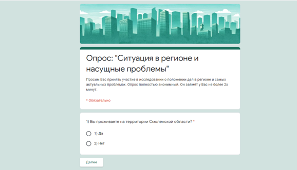 Просим Вас принять участие в исследовании о положении дел в регионе и самых актуальных проблемах. Опрос полностью анонимный. Он займёт у Вас не более двух минут.
