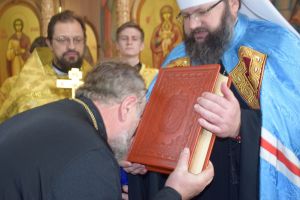 Также архипастырь преподнес в дар отцу Сергию набор служебных копий. Всем участникам литургии были подарены иконки.
