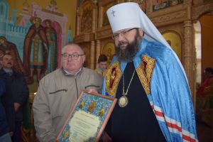 Во внимание к помощи в строительстве храма митрополит Исидор удостоил Анатолия Анатольевича Сковородкина благословенной Архиерейской грамотой,