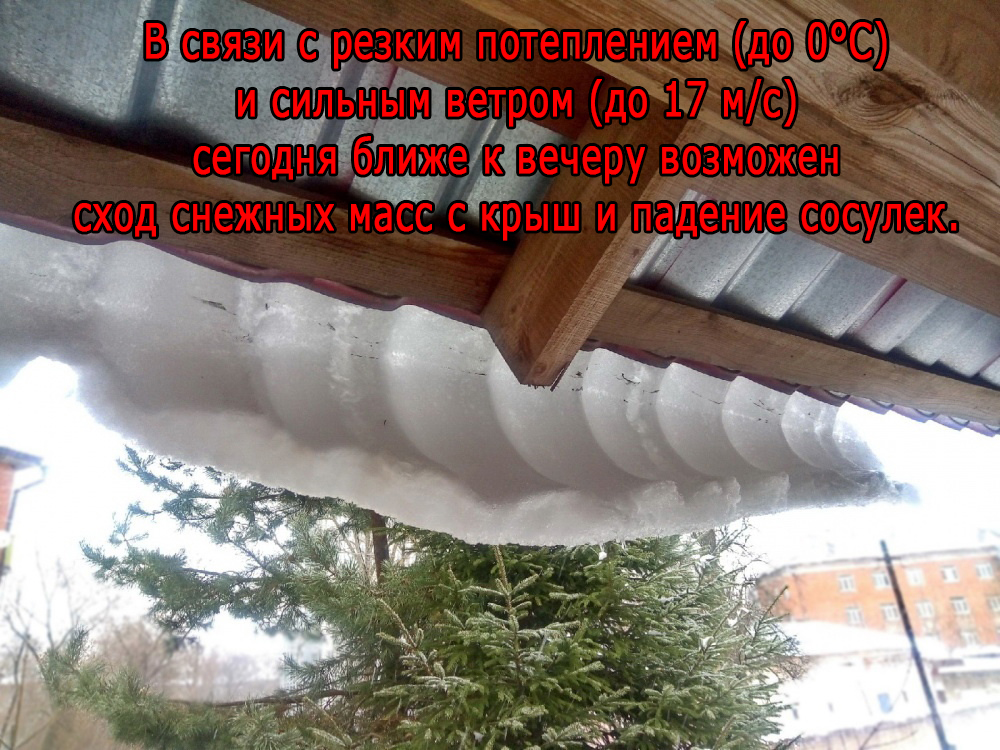 Уважаемые жители Краснинского района! Будьте предельно внимательны и осторожны! В связи с резким потеплением (до 0°C) и сильным ветром (до 17 м/с) сегодня ближе к вечеру возможен сход снежных масс с крыш и падение сосулек.