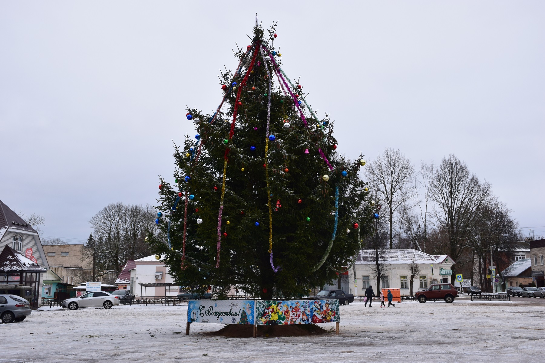 Зеленую красавицу украсили шарами, игрушками и гирляндами, которые в тёмное время суток ещё больше подчеркнут её красоту и создадут праздничное настроение местным жителям.