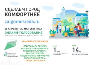 Напоминаем, что с 26 апреля по 30 мая на платформе 67.gorodsreda.ru стартует голосование, в результате которого жители Смоленской области смогут выбрать дизайн-проекты благоустройства общественных территорий в рамках реализации федерального проекта «Формирование комфортной городской среды».