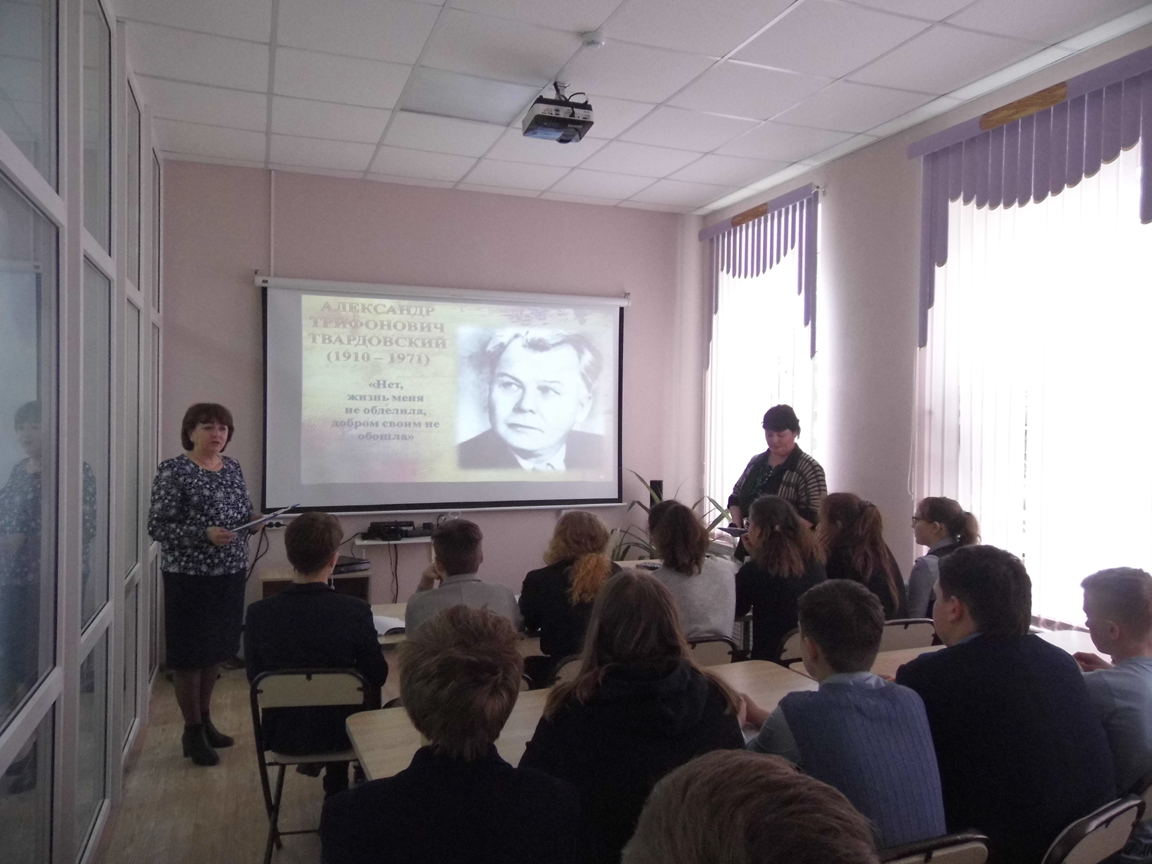 16 апреля в Краснинской центральной районной библиотеке для учащихся 7-го класса Краснинской СОШ прошёл литературный урок «Нет, жизнь меня не обделила», посвящённый жизни и творчеству Александра Трифоновича Твардовского.