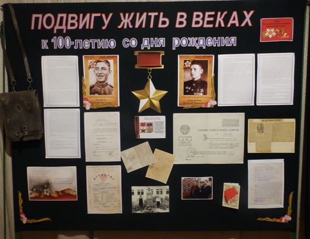 20 октября в музее открылась стендовая выставка «Подвигу жить в веках», которая посвящена 100-летию со дня рождения Героев Советского Союза - наших земляков Малихова Анатолия Наумовича и Гореленкова Алексея Ивановича.