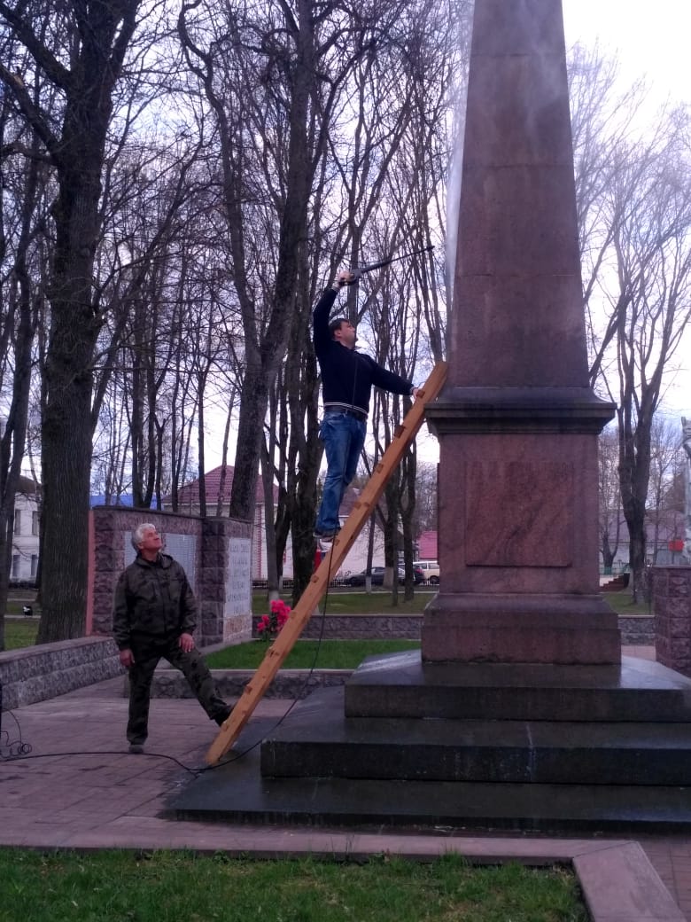 В рамках благоустройства Мемориального комплекса, расположенного в центре поселка Красный, силами сотрудников Администрации муниципального образования «Краснинский район» Смоленской области выполнена работа по очистке гранитной стелы от налета и загрязнений, возникших в результате негативного воздействия окружающей среды.