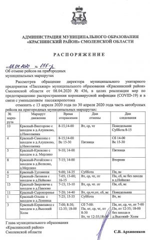 С 13 по 30 апреля 2020 года отменены обслуживаемые МУП "Пассажир" рейсы по маршруту № 146 "Красный-Смоленск" (через Мерлино) на время отправления из пгт. Красный 12-30;13-00;16-00; из г.Смоленска 13-30; 15-00;18-10.