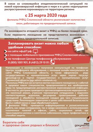 Во исполнение Указа Президента Российской Федерации от 25.03.2020 № 206 «Об объявлении в Российской Федерации нерабочих дней», Указа Губернатора Смоленской области от 18.03.2020 № 24 «О введении режима повышенной готовности», в связи с необходимостью принятия мер по нераспространению коронавирусной инфекции (2019-nCoV) Администрация муниципального образования «Краснинский район» Смоленской области временно ограничивает посещения граждан и представителей юридических лиц. Обращения можно оставить на первом этаже здания администрации в ящике для корреспонденции под информационным стендом.