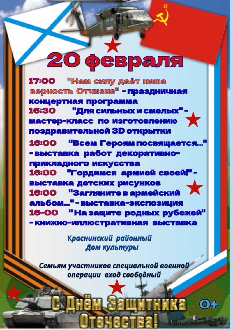 20 февраля приглашаем всех в Краснинский районный Дом культуры на праздничные мероприятия, посвящённые Дню защитника Отечества!