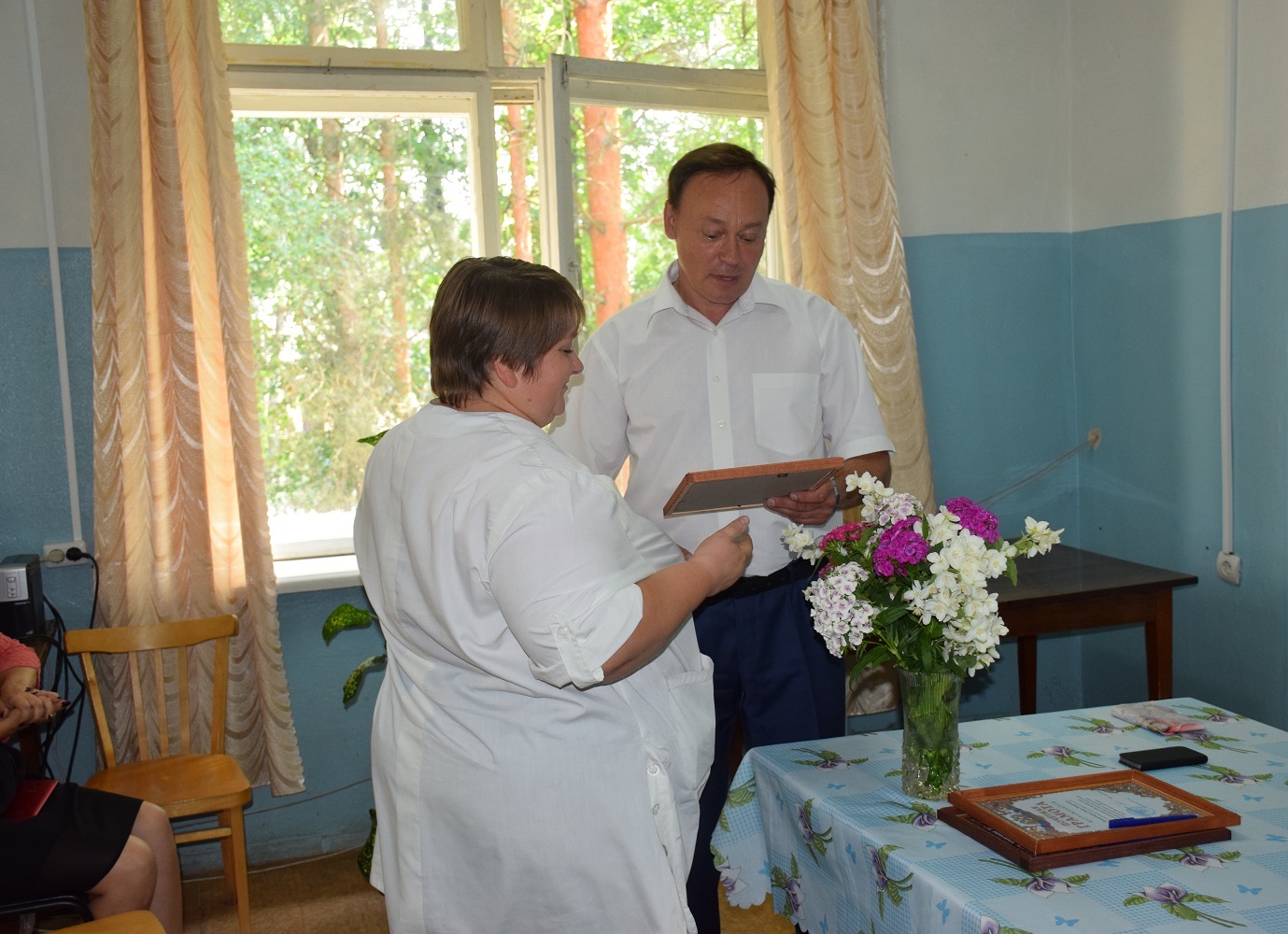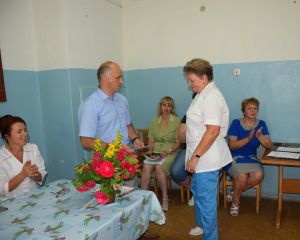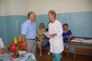 За многолетний добросовестный труд, высокопрофессиональное исполнение должностных обязанностей и в связи с празднованием Дня медицинского работника С.В. Архипенков вручил Почетные грамоты Администрации муниципального образования "Краснинский район" Смоленской области Е.В. Разинькиной - главной медицинской сестре, А.А. Тимошевскому - врачу-хирургу, Т.А. Боровковой - медицинскому регистратору, и благодарственное письмо Администрации муниципального образования "Краснинский район" Смоленской области Н.И. Андреевой - медицинской сестре хирургического отделения.