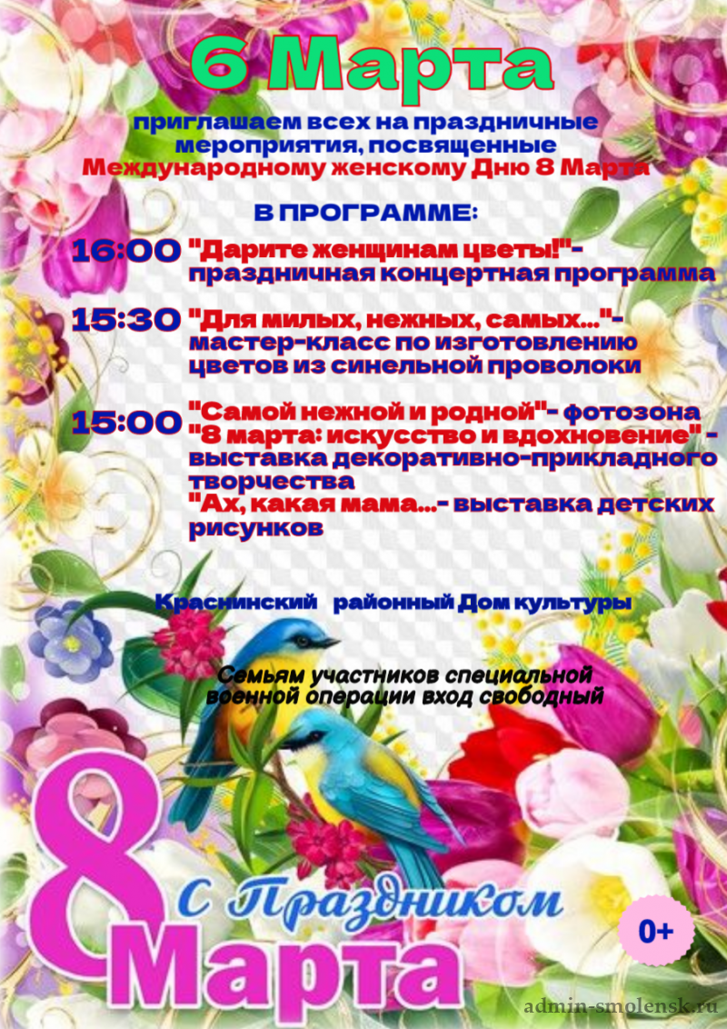 6 марта приглашаем всех на праздничные мероприятия, посвящённые Международному женскому Дню 8 Марта, которые состоятся в Краснинском районном Доме культуры.