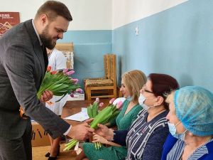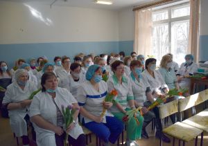 Глава муниципального образования «Краснинский район» Смоленской области Сергей Валентинович Архипенков, председатель Краснинской районной Думы Игорь Владимирович Тимошенков и депутат Государственной Думы Федерального Собрания Российской Федерации Артём Викторович Туров поздравили с наступающим праздником прекрасную половину коллектива центральной районной больницы и вручили им цветы.