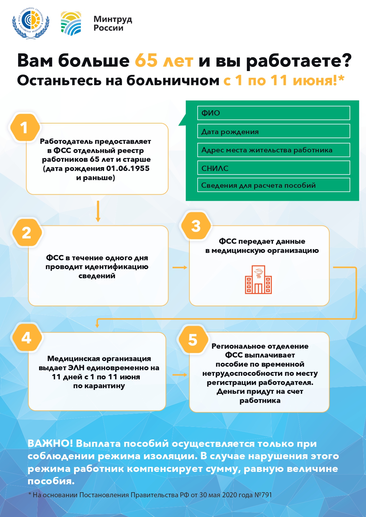 Важно отметить, что листок нетрудоспособности не выдается работникам 65+, которые в период с 1 по 11 июня находятся в отпуске или на удаленном режиме работе.