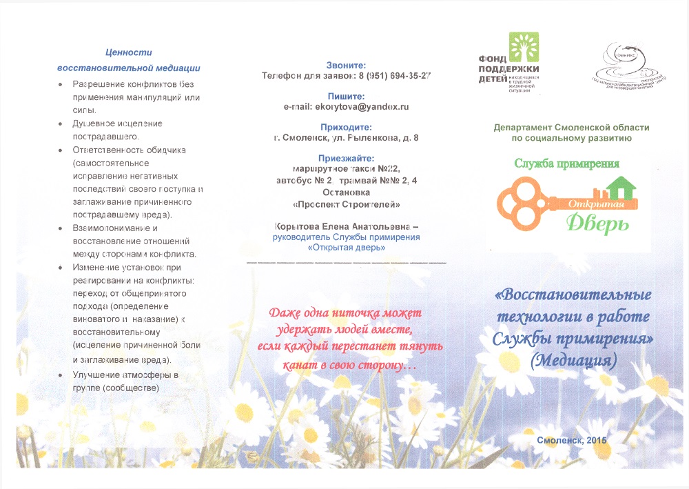 В семинаре приняли участие: руководитель Службы примирения «Открытая дверь» - Корытова Елена Анатольевна, воспитатель ОГБУ СРЦН «Феникс» – Жукова Наталья Юрьевна. Специалисты познакомили присутствующих с работой Службы примирения «Открытая дверь», которая успешно функционирует на базе ОГБУ «Социально-реабилитационный центр для несовершеннолетних «Феникс», поделились опытом в разрешении конфликтных ситуаций, дали рекомендации по работе с детьми, а также их родителями, опираясь на примеры из собственной практики.