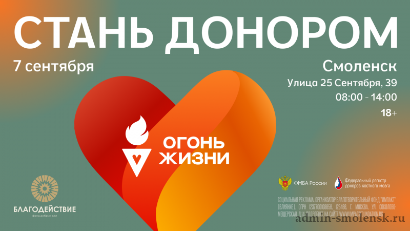 7 сентября 2025 года в Смоленске пройдут мероприятия второго этапа Всероссийской эстафеты факела «Огонь жизни». Эстафету запустили ФМБА России совместно с Фондом добрых дел «Благодействие» и Фондом поддержки социальных инициатив «Огонь жизни». В первом этапе эстафеты, объединившем более 50 городов, приняли участие свыше 84 тыс. человек, более 50 тыс. совершили донации крови, а Федеральный регистр доноров костного мозга пополнился на 8 тысяч потенциальных доноров.