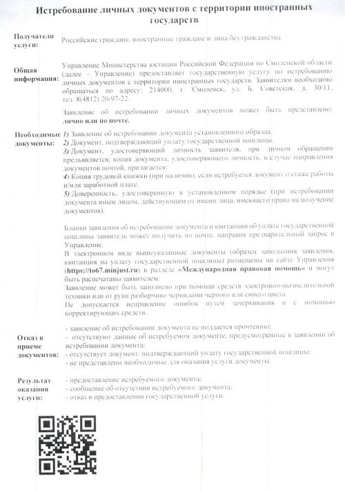 С целью повышения правовой грамотности населения Управлением Министерства юстиции Российской Федерации по Смоленской области (далее Управление) разработана информационная листовка о предоставлении услуги по истребованию личных документов с территории иностранных государств, которая содержит информацию о том: кто может получить данную услугу, о возможности предоставления услуги лично и по почте о перечне документов, необходимых для оказания услуги, результате оказания услуги, а также ссылка в виде QR-кода на официальный интернет-сайт Управления, где содержится подробная информация по данному вопросу.