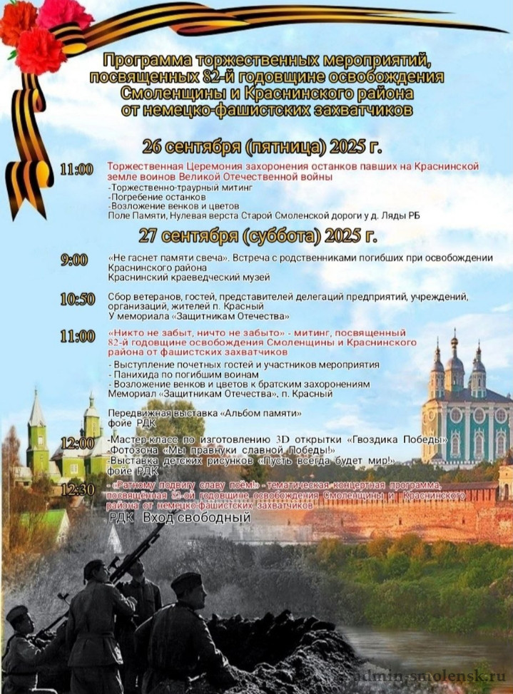 Приглашаем посетить торжественные мероприятия, посвященные 82-й годовщине освобождения Смоленщины и Краснинского района от немецко-фашистских захватчиков!