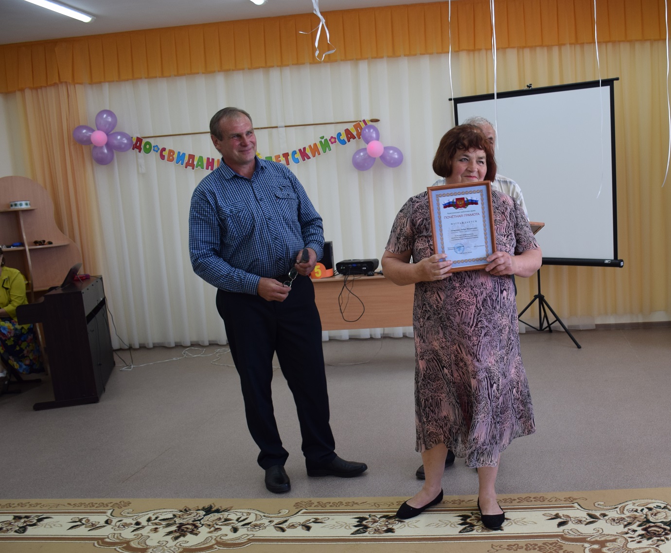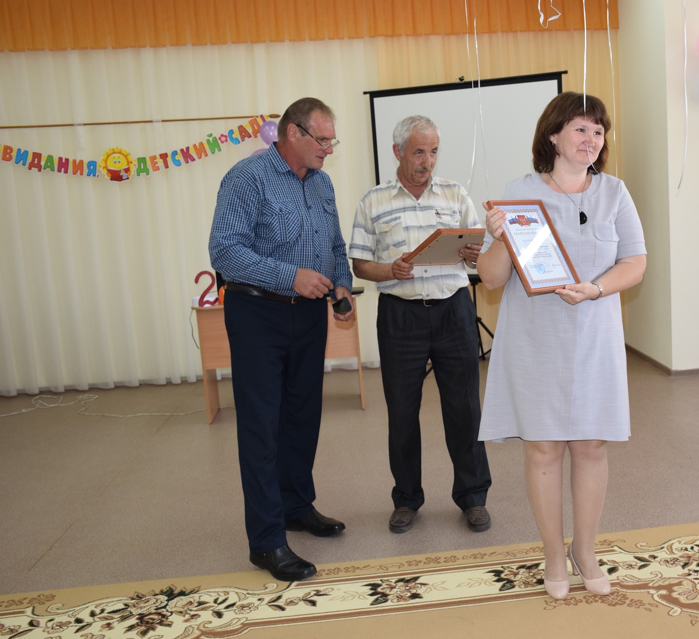 Напутственные слова детям и родителям произнесла заведующий детским садом Нестеренкова Валентина Николаевна, вручив воспитанникам памятные подарки. Также выпускников и воспитателей поздравили депутаты Краснинской районной Думы Языненков Андрей Иванович и Чернин Геннадий Славиевич, которые наградили Пищулину Лидию Михайловну, Козыреву Галину Викторовну, Клевцову Татьяну Анатольевну и Нестеренкову Валентину Николаевну Почетными грамотами Краснинской районной Думы, за высокий профессионализм, творческую активность, весомый вклад в воспитание детей дошкольного возраста.