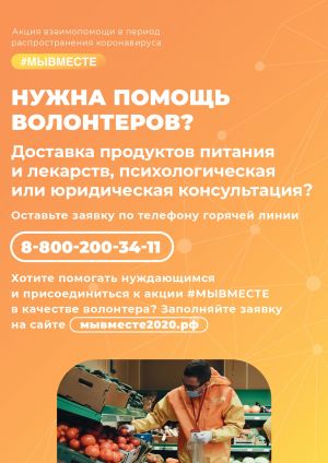 В связи с ухудшением санитарно-эпидемиологической обстановки Всероссийское общественное движение «Волонтеры – медики» и Ассоциация волонтёрских центров возобновляют проведение общероссийской акции взаимопомощи в ситуации новой коронавирусной инфекции #МыВместе.